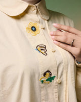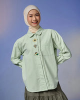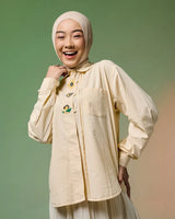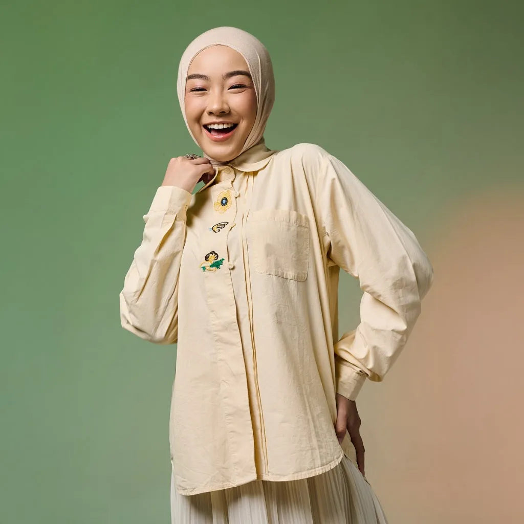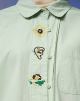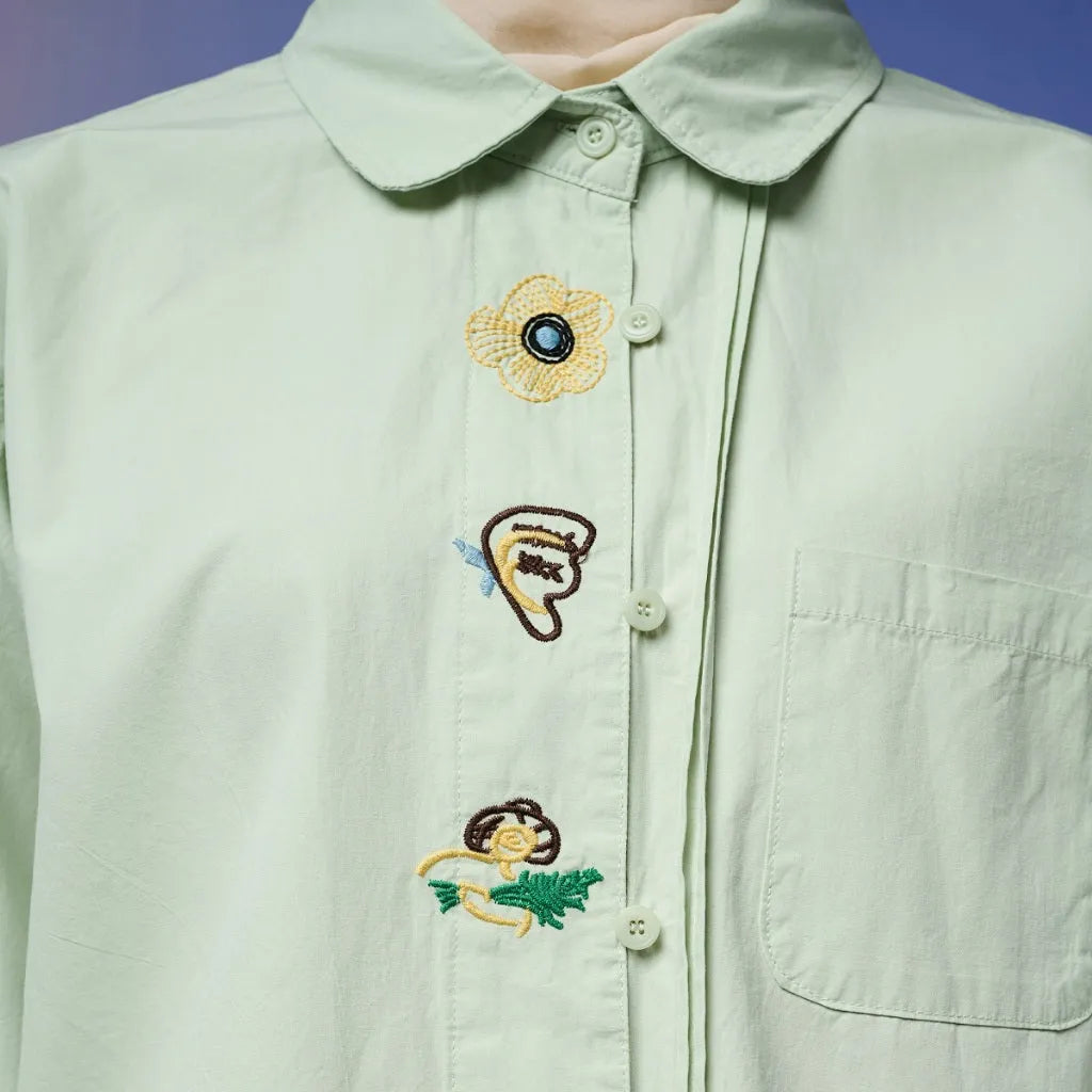 Kemeja ini hadir dengan detail bordir yang memadukan kesan cute dan edgy, menciptakan tampilan playful namun tetap berkarakter. Bordir halus pada bagian depan maupun lengan memberikan sentuhan manis yang tidak berlebihan, sehingga mudah dipadukan untuk berbagai gaya.