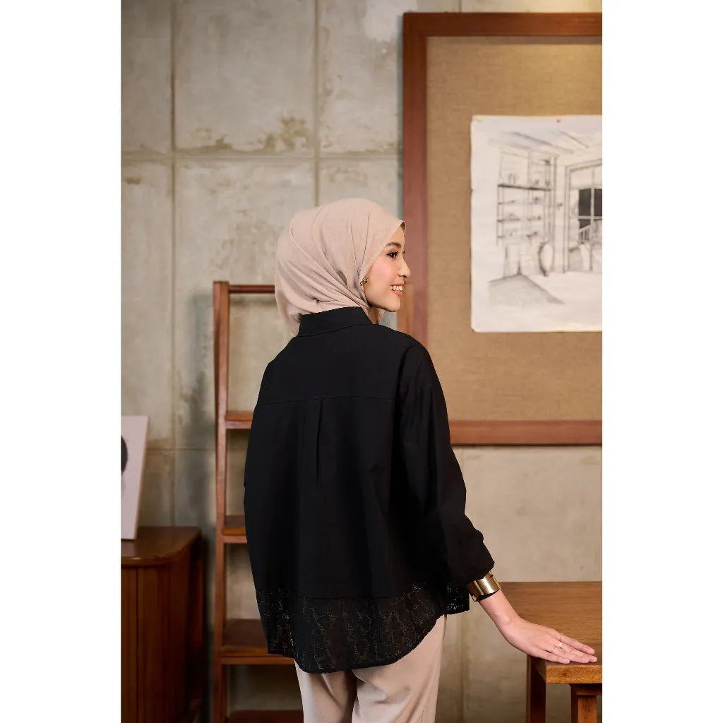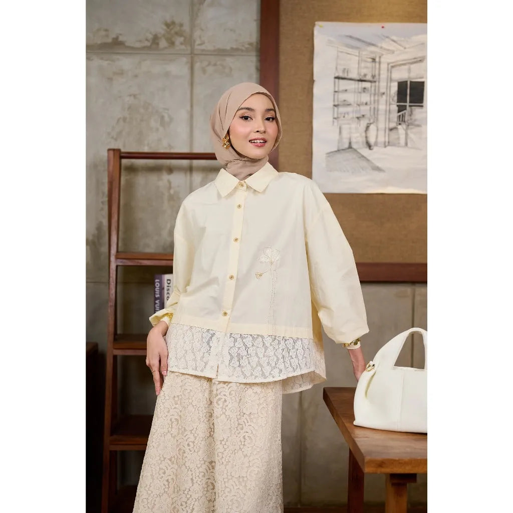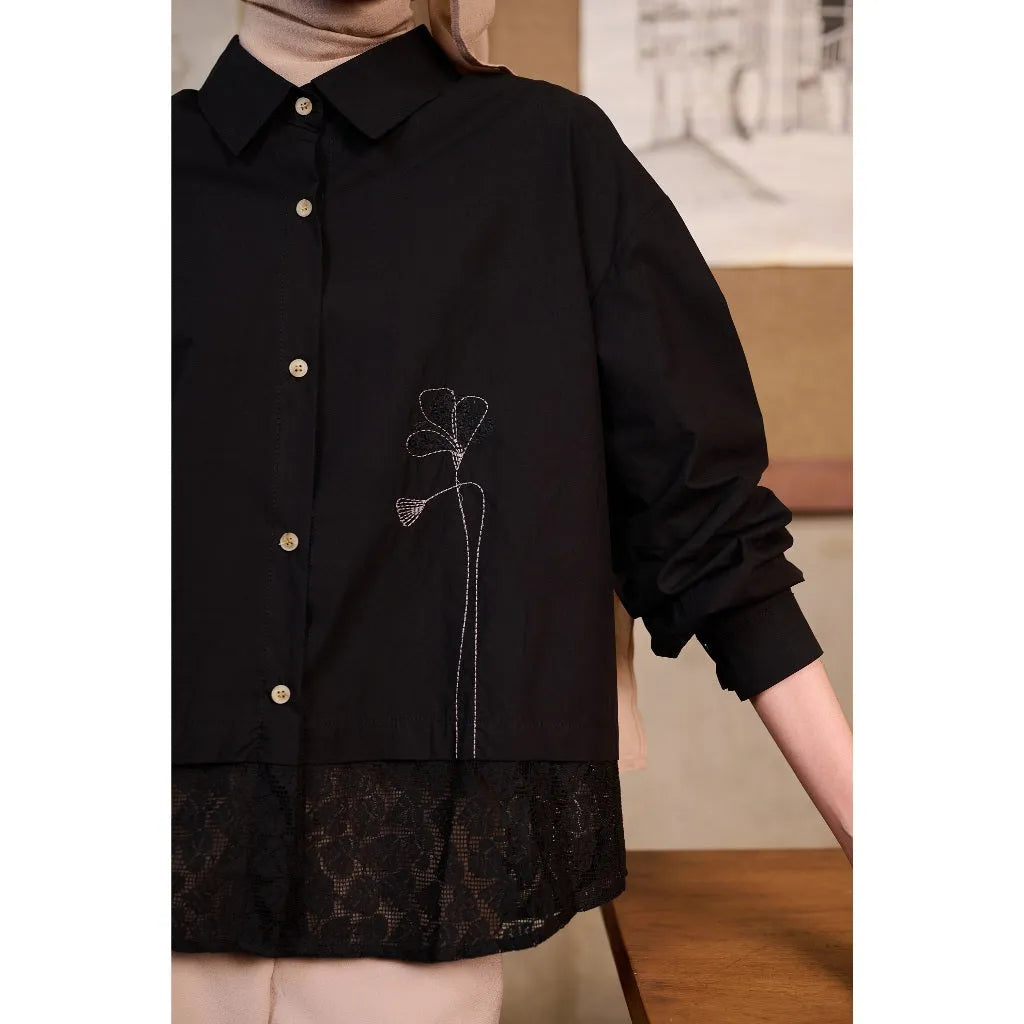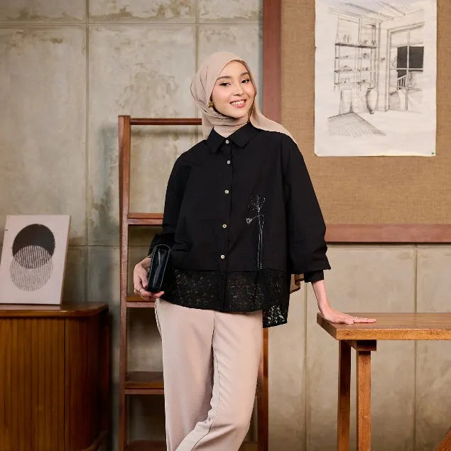 Kemeja wanita ini dirancang dengan perpaduan detail brokat pada bagian bawah dan bordir halus di bagian depan, menghadirkan tampilan yang elegan sekaligus unik. Sentuhan brokat memberikan kesan feminin dan anggun, sementara bordir artistik menambah karakter yang classy namun tetap modern.