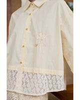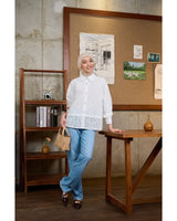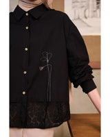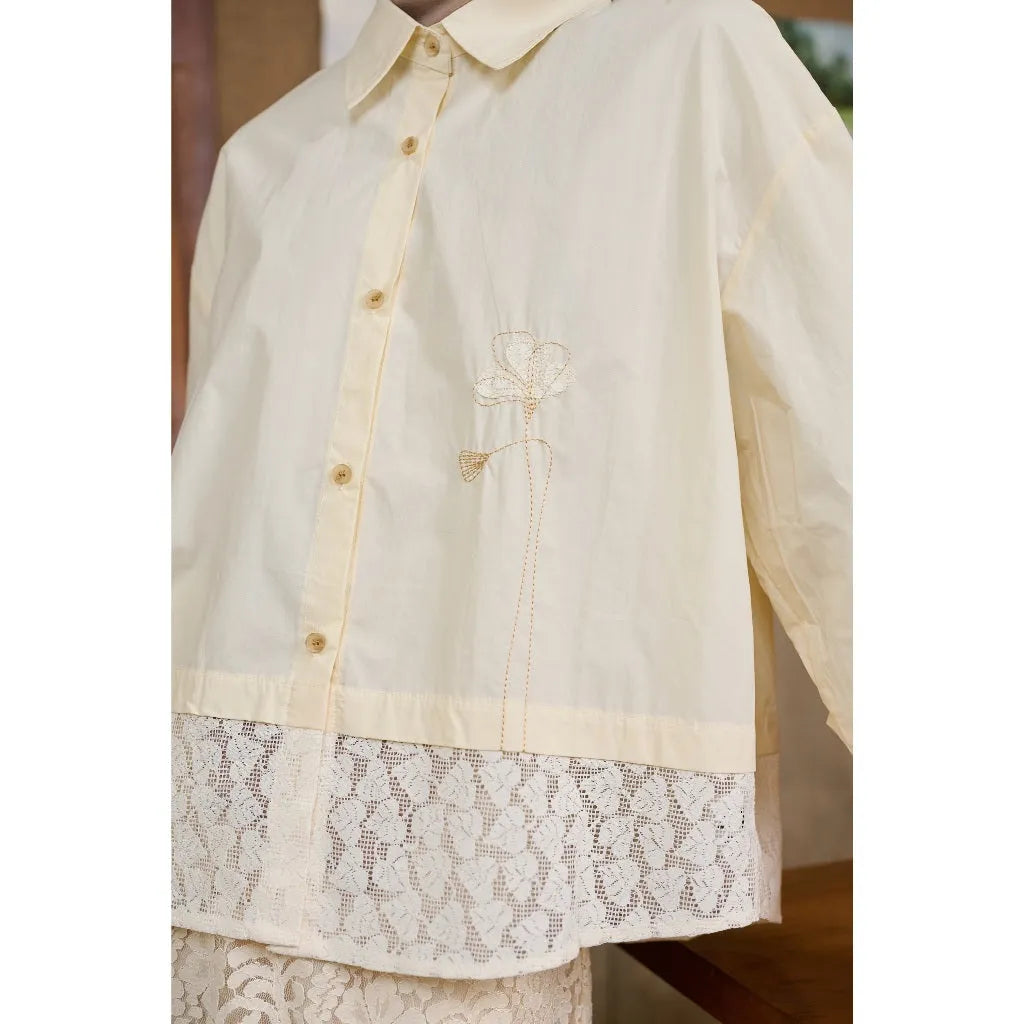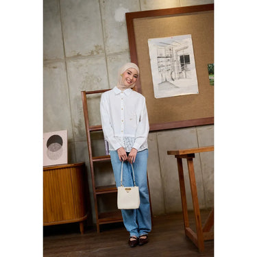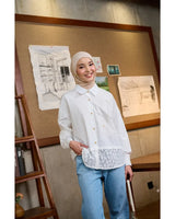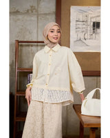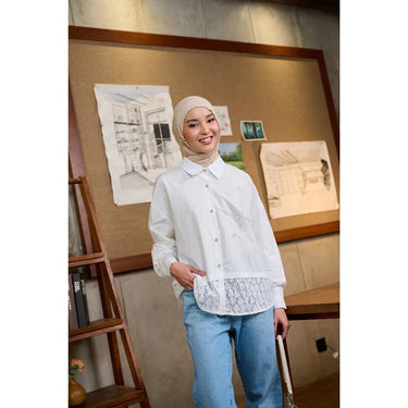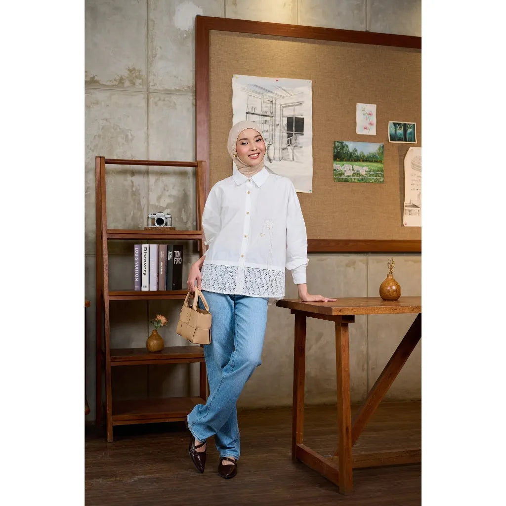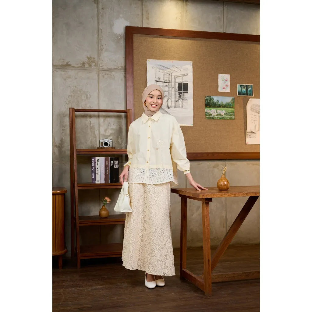 Kemeja wanita ini dirancang dengan perpaduan detail brokat pada bagian bawah dan bordir halus di bagian depan, menghadirkan tampilan yang elegan sekaligus unik. Sentuhan brokat memberikan kesan feminin dan anggun, sementara bordir artistik menambah karakter yang classy namun tetap modern.