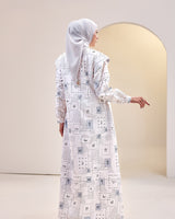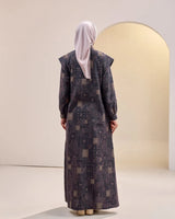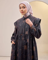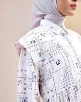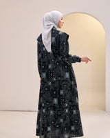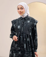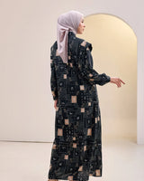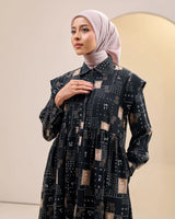 Dress busui dan wudhu friendly motif aksara Bengkulu ini didesain dengan detail tambahan layer pada bagian lengan yang membuat tampilan sederhana menjadi lebih menarik dan elegan. Dress ini dilengkapi dengan kerah yang mudah dibuka dan bukaan full kancing pada bagian depan.