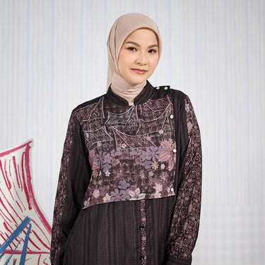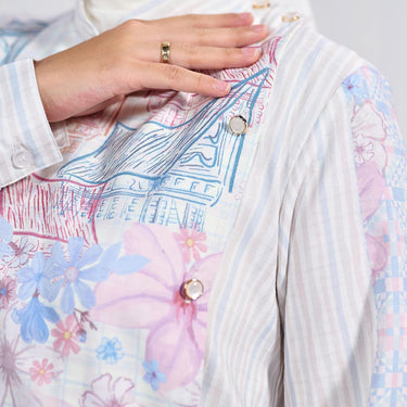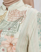 Motif ilustratif bernuansa etnik dan floral menjadi point utama yang memperkaya nilai estetika, menghadirkan kesan feminin sekaligus artsy. Pada bagian body, motif garis vertikal memberikan efek visual yang jenjang sehingga siluet tubuh terlihat lebih ramping dan proporsional. Lengan manset menambah kesan rapi dan elegan, cocok untuk tampilan yang polished.