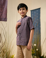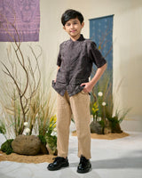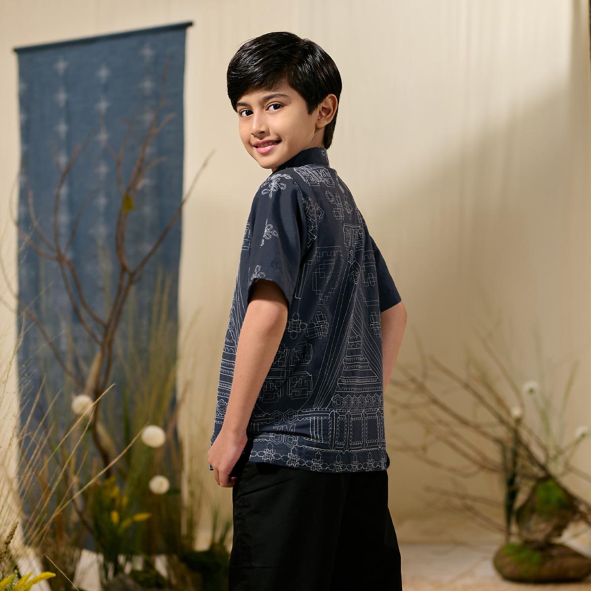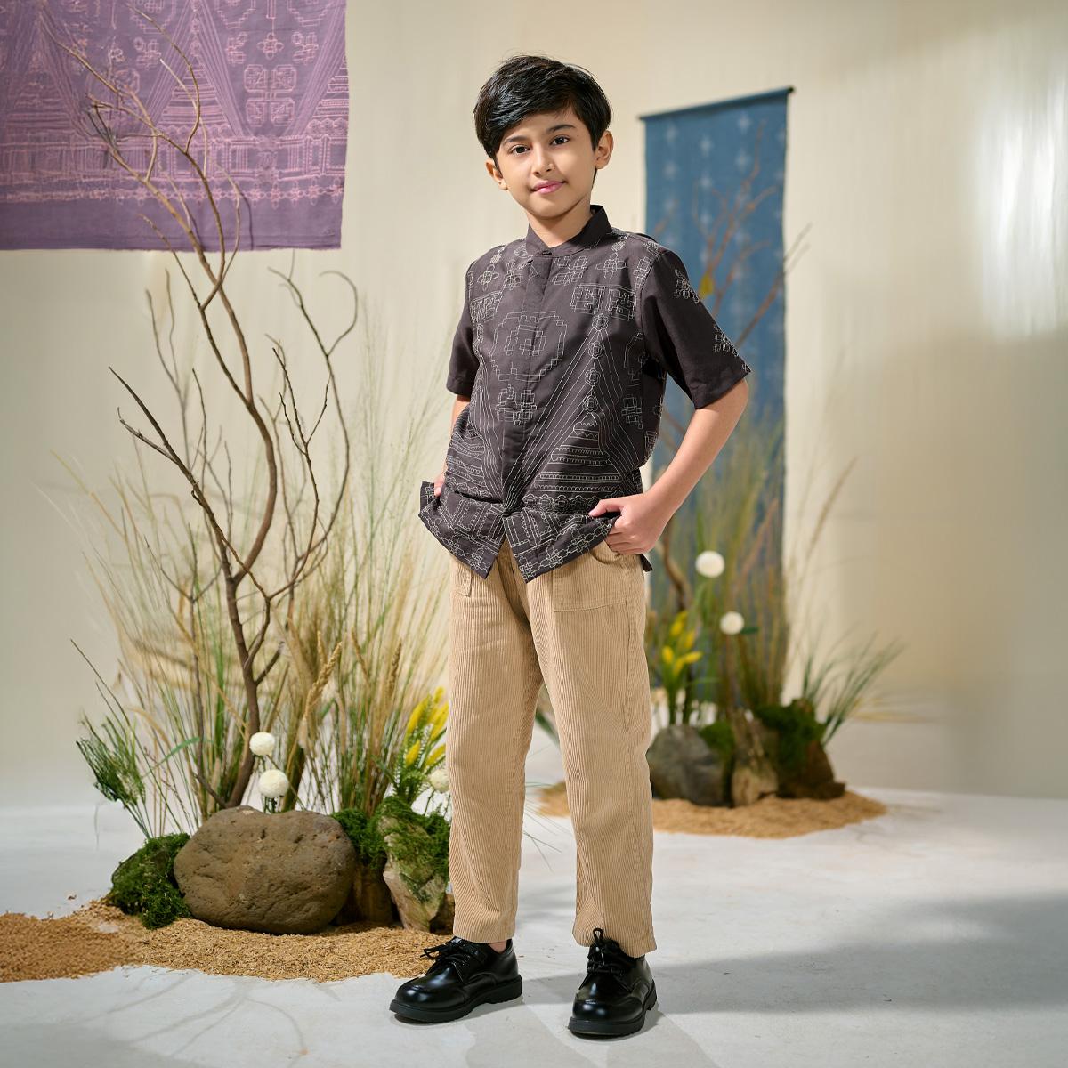 Kemeja anak dirancang dengan potongan rapi namun tetap nyaman untuk bergerak aktif. Detail bordir etnik yang selaras dengan kemeja ayah menciptakan tampilan keluarga yang kompak dan harmonis.