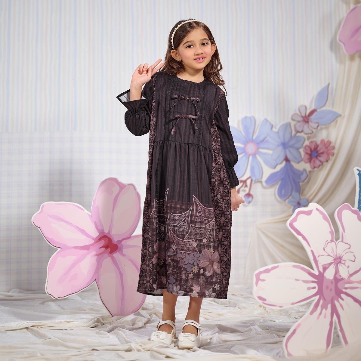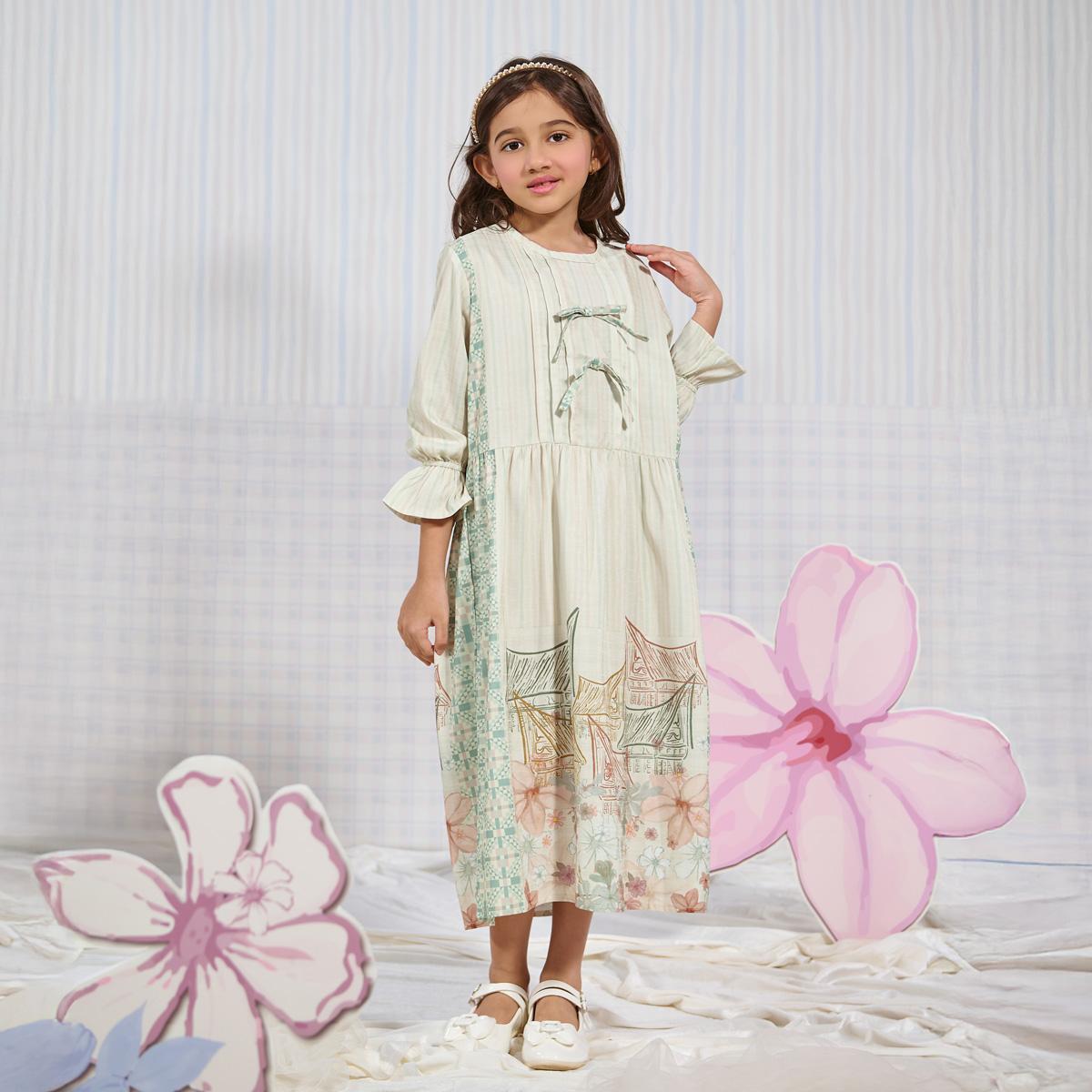 Dress anak ini dirancang dengan motif modern yang terinspirasi dari Rumah Adat Batak Toba, dipadukan dengan detail lipit dan pita di bagian depan yang memberikan kesan manis, rapi, dan menggemaskan. Dilengkapi resleting di bagian belakang serta lengan dengan karet, sehingga mudah dipakai dan nyaman untuk aktivitas anak.