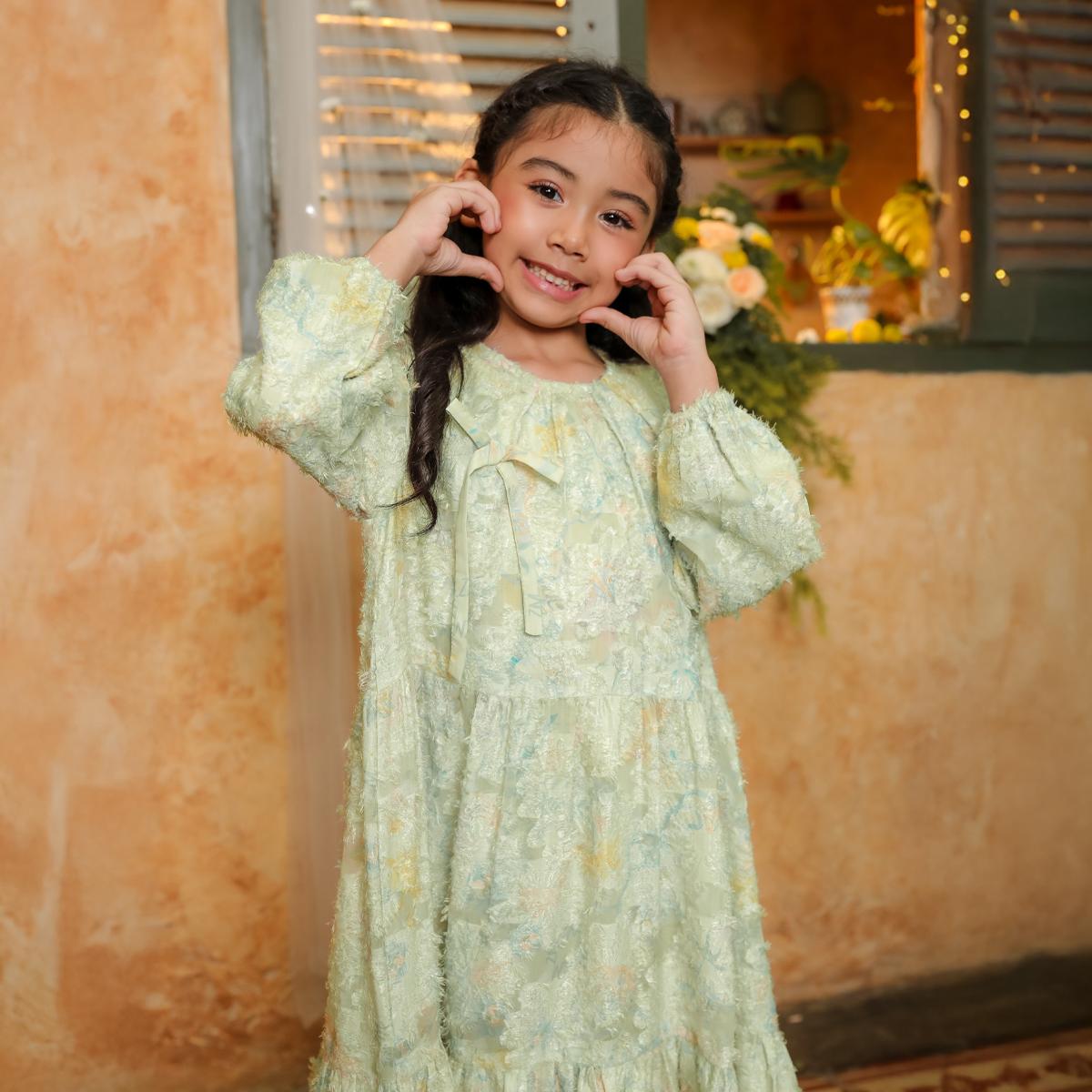 - Dress Anak: Detail pita di dada, ruffle bertingkat, siluet nyaman