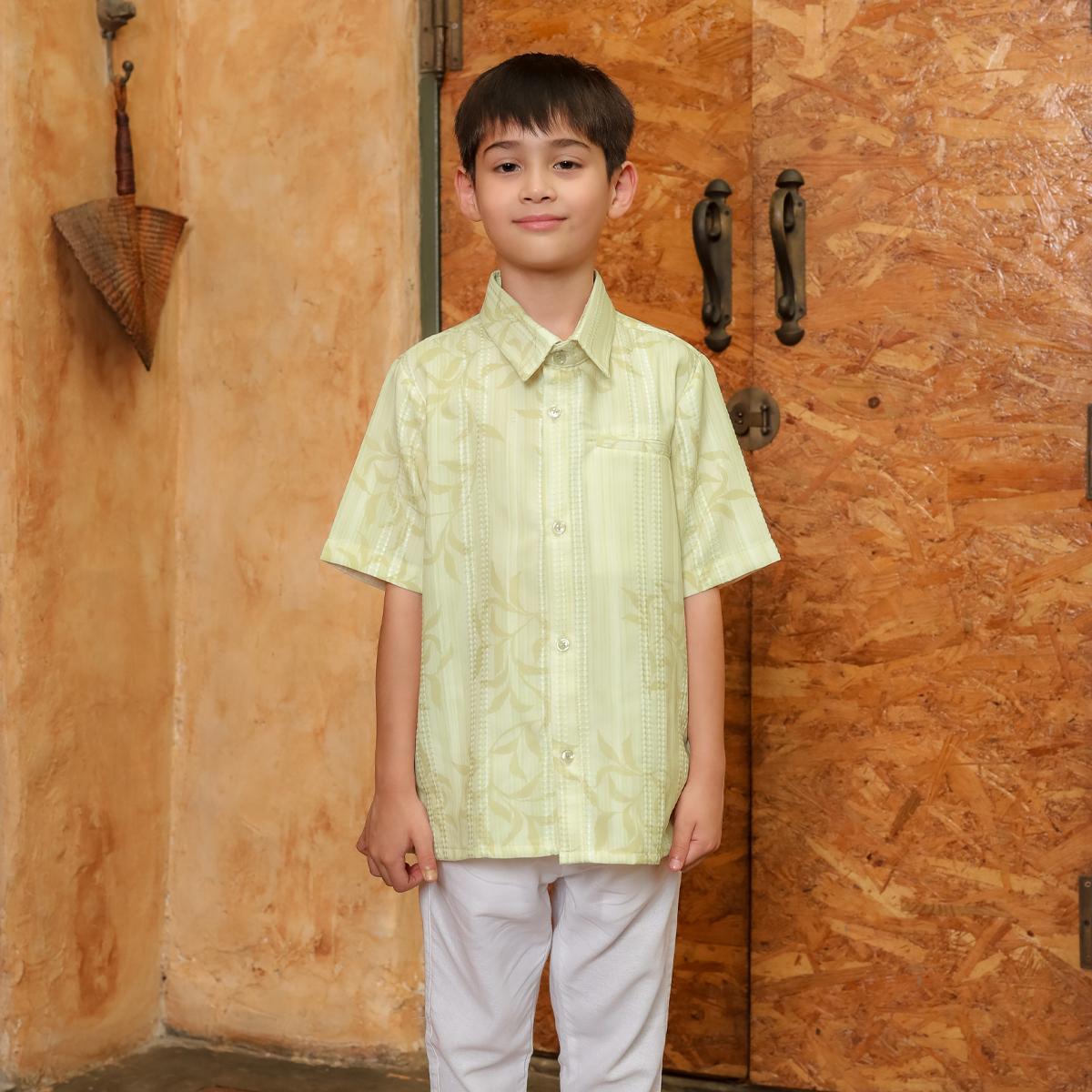 - Kemeja Ayah & Anak: Kerah kemeja, kancing depan, motif simple