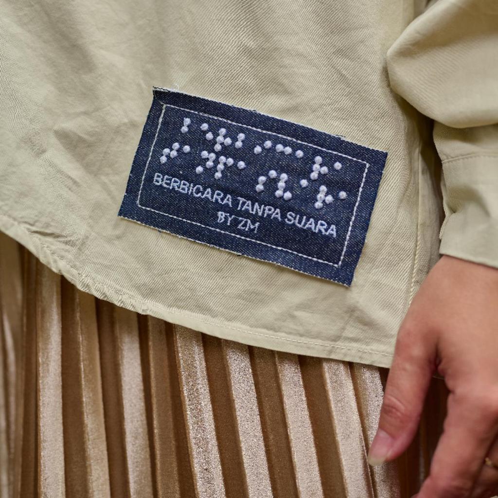Nada Blouse Edisi Berbicara Tanpa Suara hadir sebagai perwujudan pesan cinta yang tak selalu terucap, namun dapat dirasakan. Kemeja ini didesain dengan detail bordir huruf braille bertuliskan “Berbicara Tanpa Suara”, dibordir dengan tekstur timbul yang menyampaikan makna—bukan sekadar dibaca, tetapi dirasakan dengan hati.