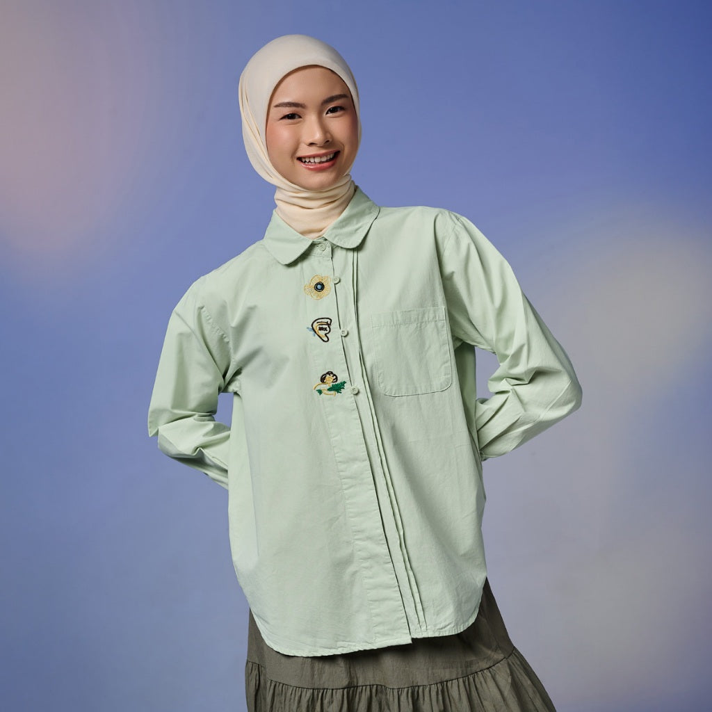 Kemeja ini hadir dengan detail bordir yang memadukan kesan cute dan edgy, menciptakan tampilan playful namun tetap berkarakter. Bordir halus pada bagian depan maupun lengan memberikan sentuhan manis yang tidak berlebihan, sehingga mudah dipadukan untuk berbagai gaya.