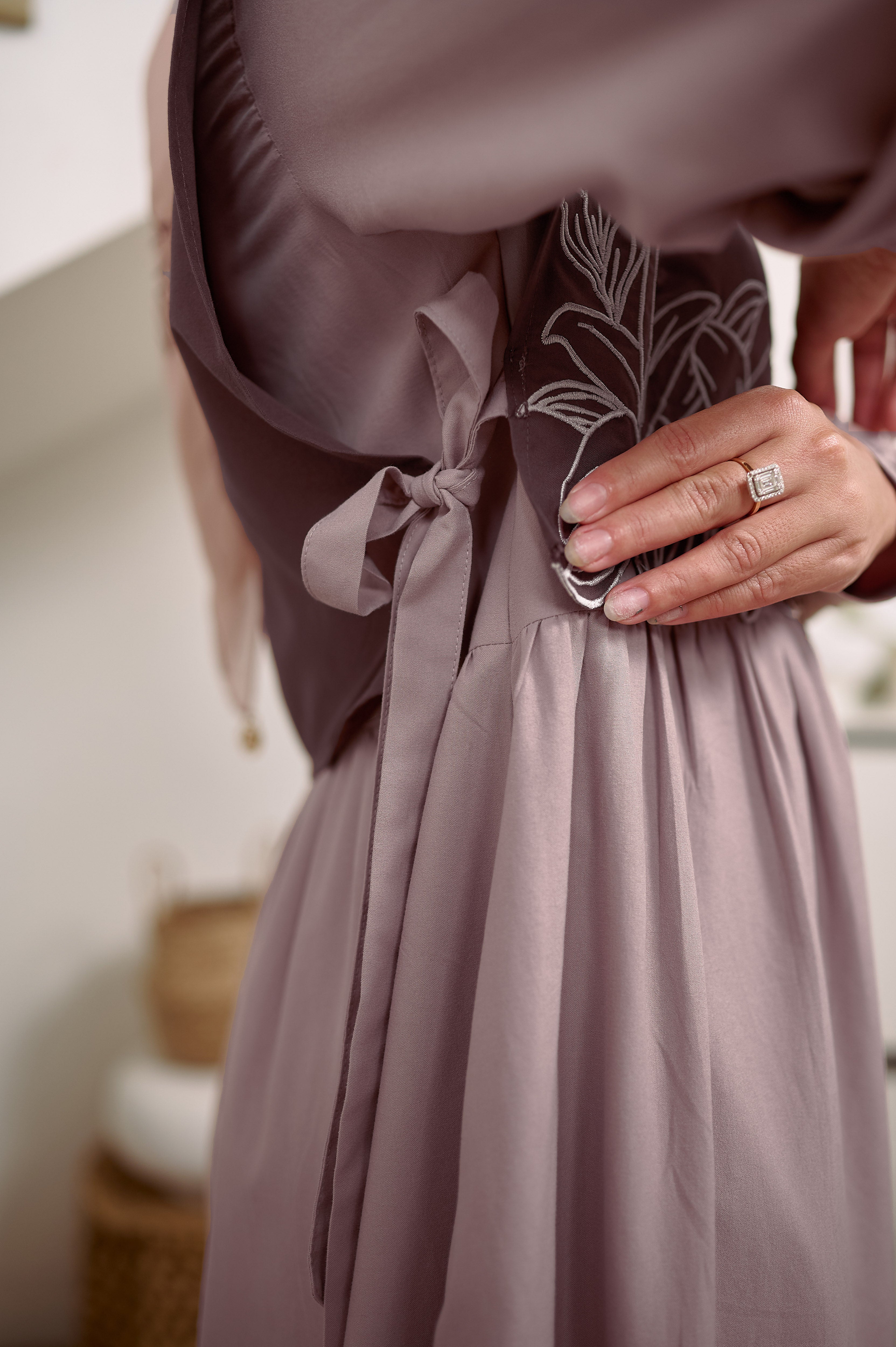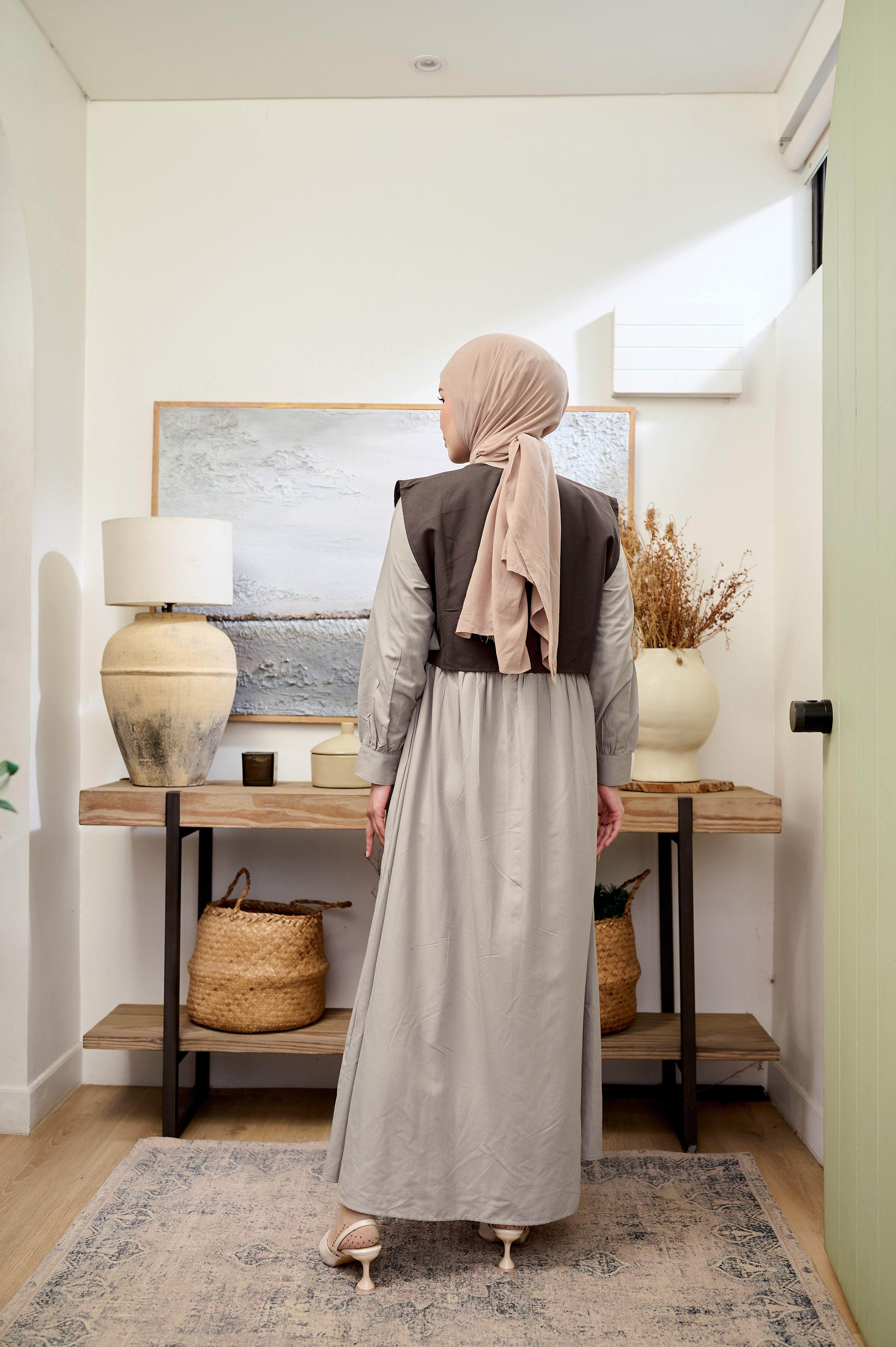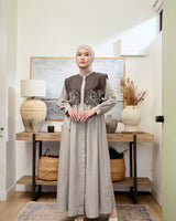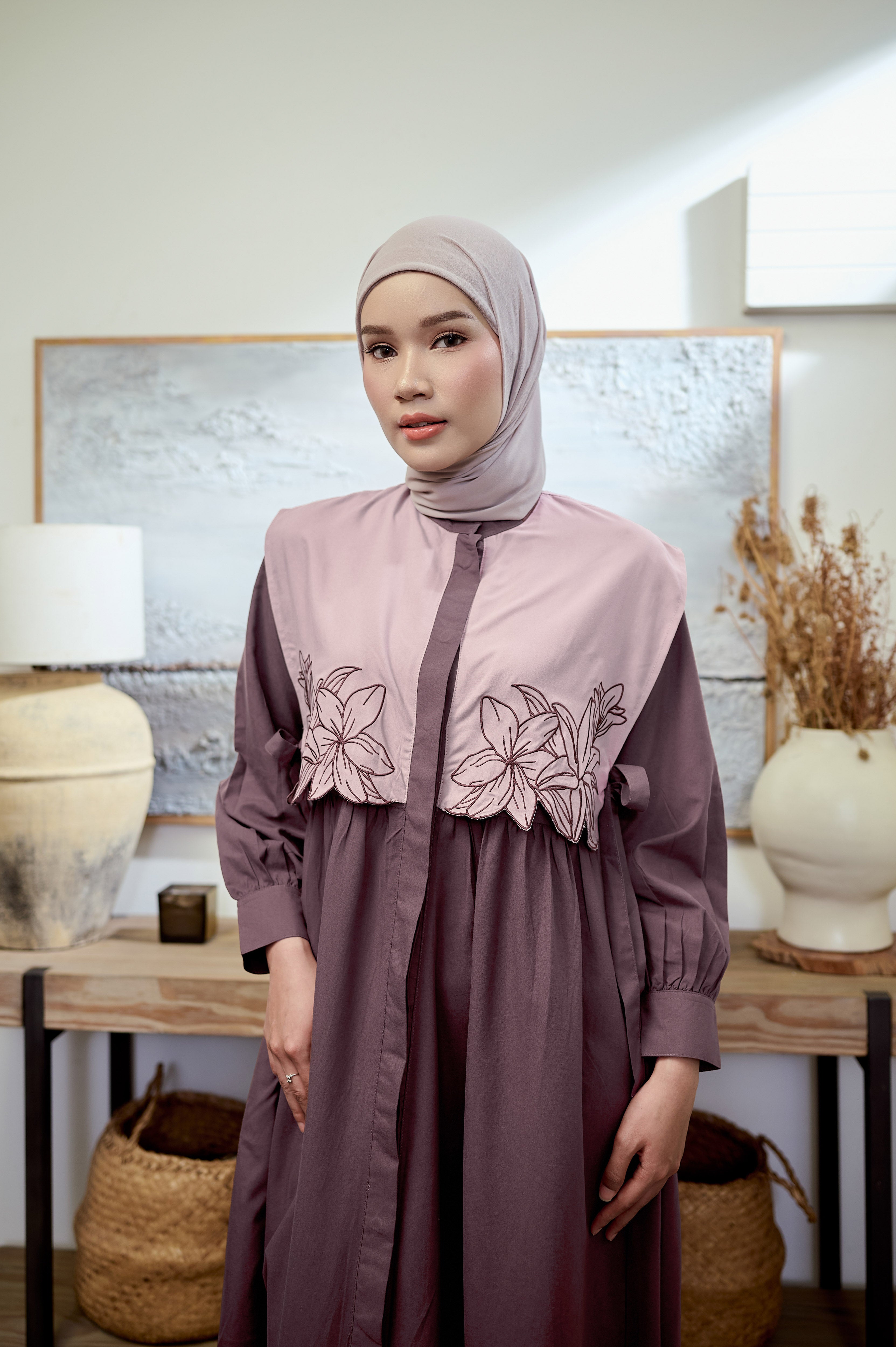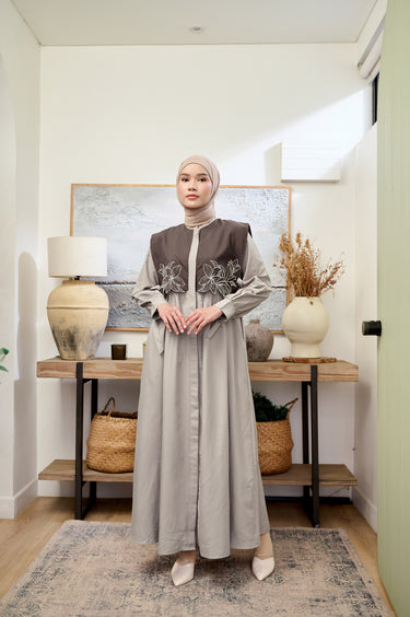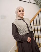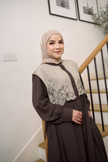 Dress ini didesain dengan detail layer rompi yang elegan, memberikan kesan modern namun tetap anggun. Bagian atas dress dihiasi dengan bordir artistik yang menghadirkan sentuhan mewah dan berkarakter. Tali samping di area pinggang menambah aksen feminin yang menegaskan siluet tubuh, menciptakan tampilan chic dan proporsional.