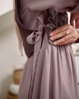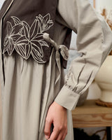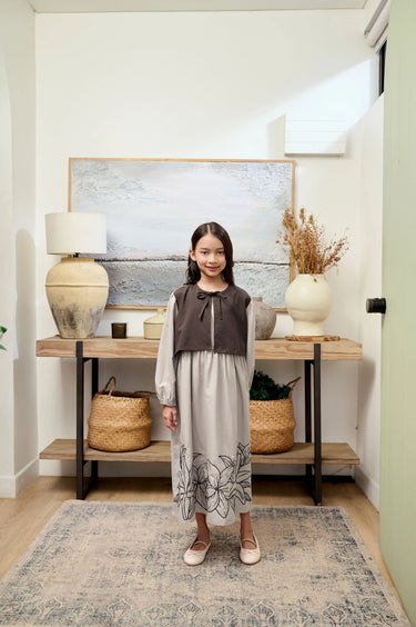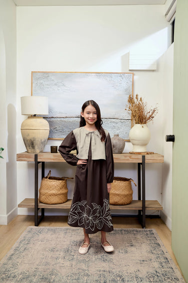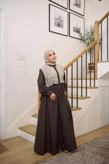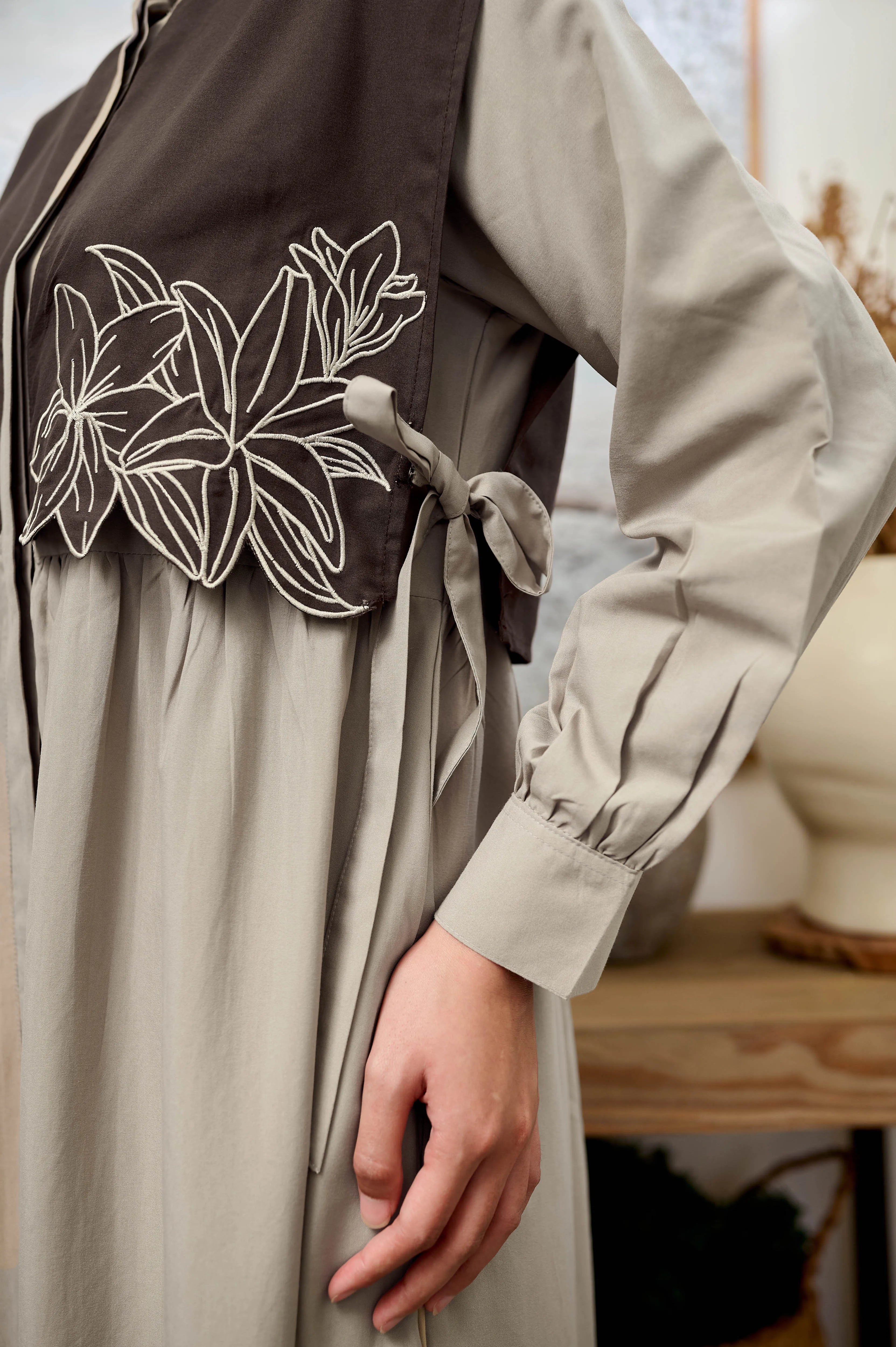 Dress ini didesain dengan detail layer rompi yang elegan, memberikan kesan modern namun tetap anggun. Bagian atas dress dihiasi dengan bordir artistik yang menghadirkan sentuhan mewah dan berkarakter. Tali samping di area pinggang menambah aksen feminin yang menegaskan siluet tubuh, menciptakan tampilan chic dan proporsional.