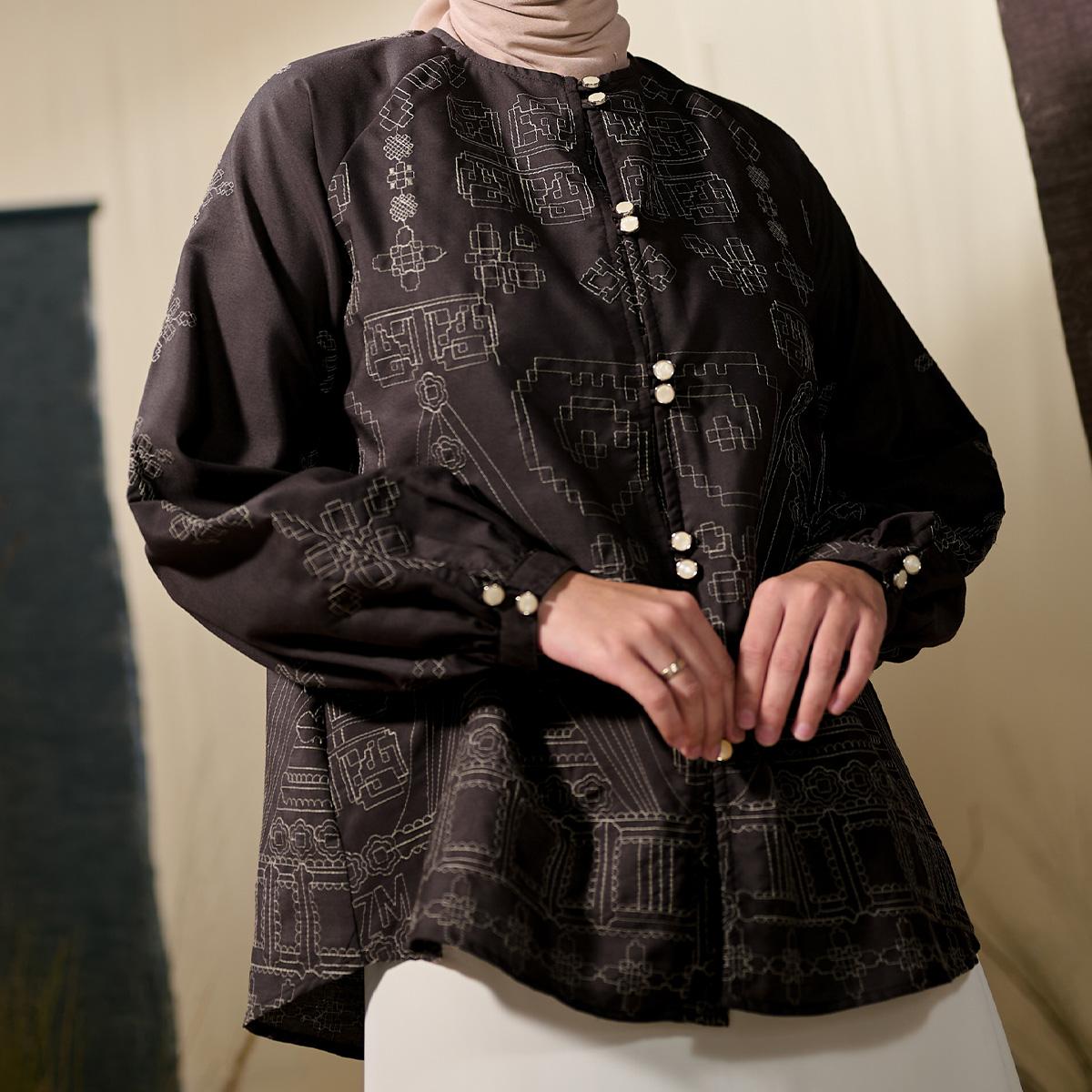 Bagian depan dihiasi dengan kancing hias yang mempercantik tampilan tanpa mengurangi kesan clean, sementara manset dengan aksen bordir menjadi detail eksklusif yang mempertegas karakter etnik elegan pada blouse ini. Perpaduan desain modern, sentuhan tradisional, dan detail mewah menjadikan blouse ini tampil menonjol namun tetap sophisticated.