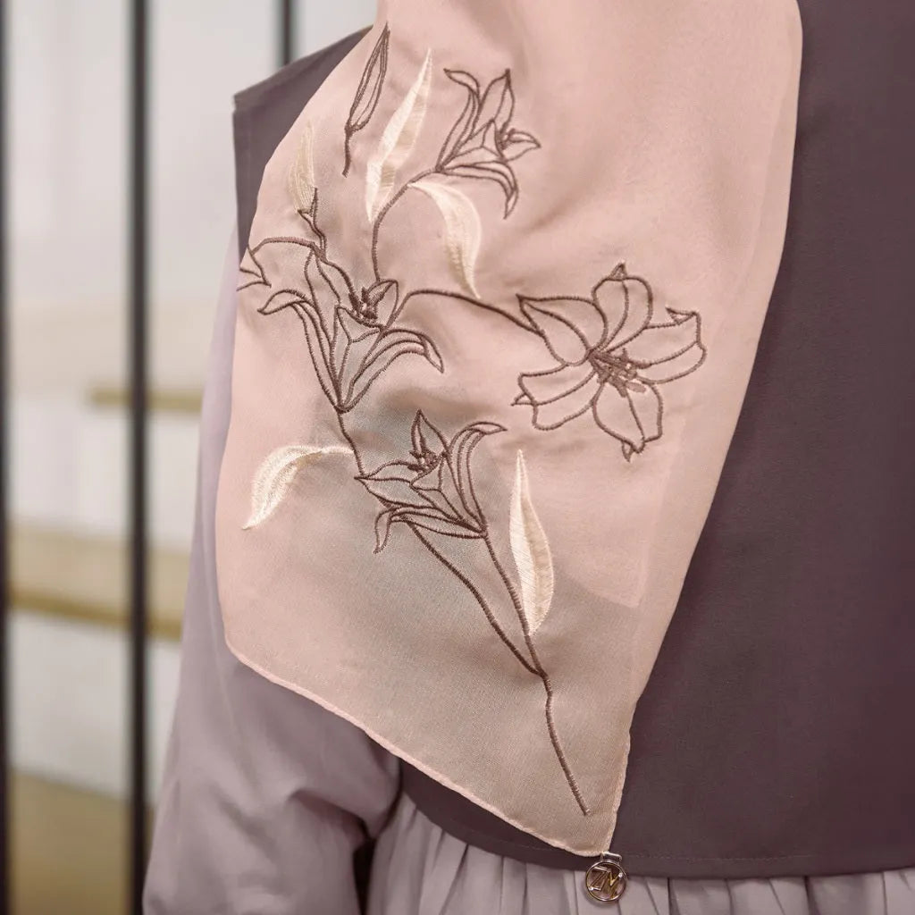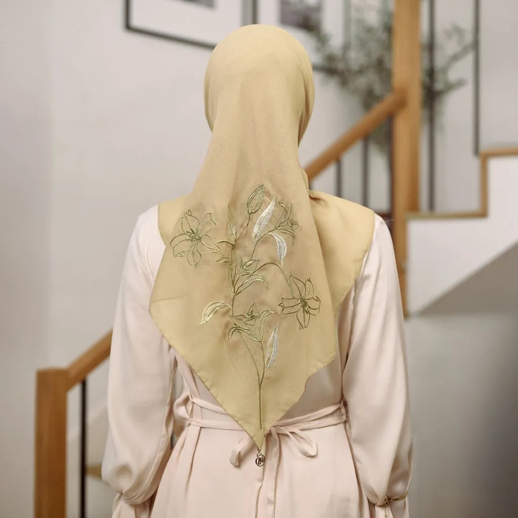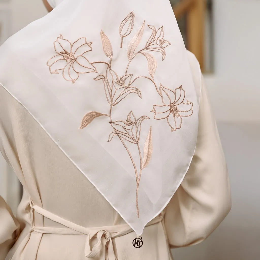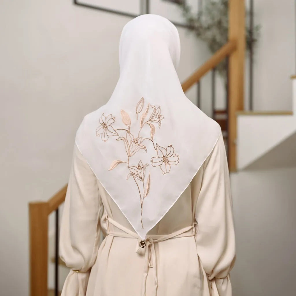 Tampilkan gaya yang elegan dan lembut dengan hijab segi empat bermotif bordir bunga lily yang dibuat khusus untuk menghadirkan sentuhan feminin pada setiap penampilan. Terbuat dari Double Hicon Premium, bahan ini terkenal memiliki tekstur halus, ringan, tidak mudah kusut, dan sangat mudah dibentuk—cocok untuk tampilan simple maupun gaya hijab kreasi.